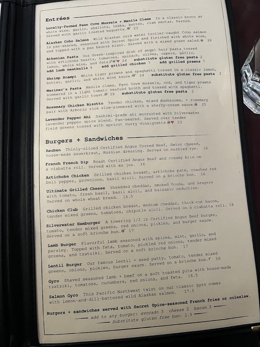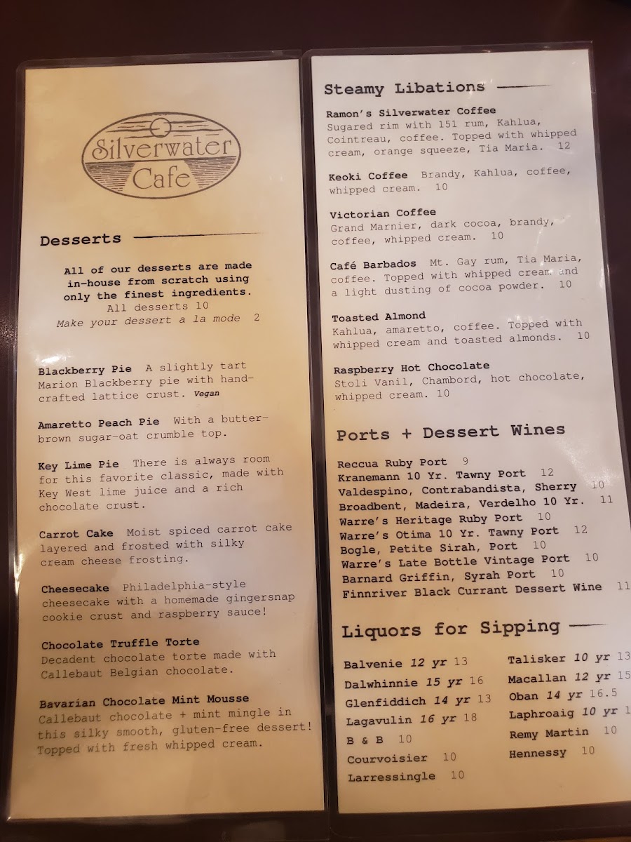 Welcome to Silverwater Cafe, a hidden gem located at 237 Taylor St, Port Townsend, WA. This charming eatery invites you to experience a delightful blend of flavors in a historic setting. Renowned for its freshly made dishes, the menu showcases culinary highlights such as the Hazelnut Halibut which has garnered rave reviews for its exquisite taste, alongside creamy clam chowder and delectable gyros with crispy meat and warm pita.